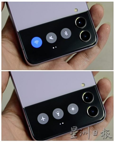 首先,三星为外屏添加了很多快捷键。如果你是安卓用户,当你从屏幕上方刷下来会看到快捷键的清单。同样地,当你点开折叠机外屏,刷下来以后会看到Wi-Fi、数据网络、蓝牙、飞行模式、音量和手电筒这个6个快捷键。对比上一代只能调节音量和灯光,这一次能够让用户不用翻开手机,直接启动Wi-Fi、打开手电筒等,相当不错。