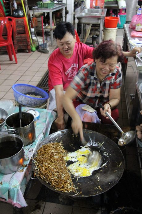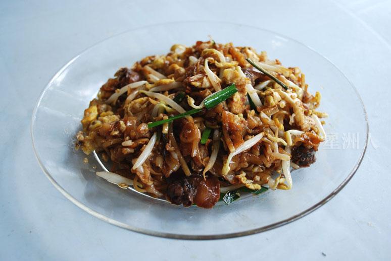 早晚各一摊,皆以大型平底锅炭炒,风味略有不同,却同样附上一小碟加上半个桔子的参峇辣椒酱。材料简单,名称早已说明,可蚶,可蛋,可蚶蛋同炒,亦可斋炒什么都不放,只是基本的粿条、豆芽和韭菜。