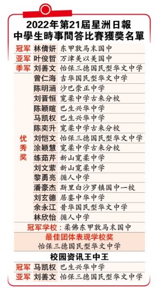 (八打灵再也1日讯)柔佛东甲敦马末国中在2022年第21届星洲日报中学生时事问答比赛中,双喜临门。