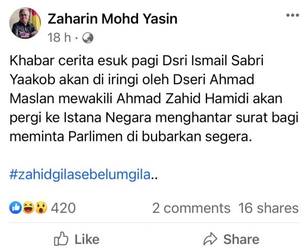扎哈林在脸书发文表示,首相将在巫统总秘书拿督斯里阿末马斯兰的陪同下,代表巫统主席阿末扎希到国家皇宫呈交有关信函。