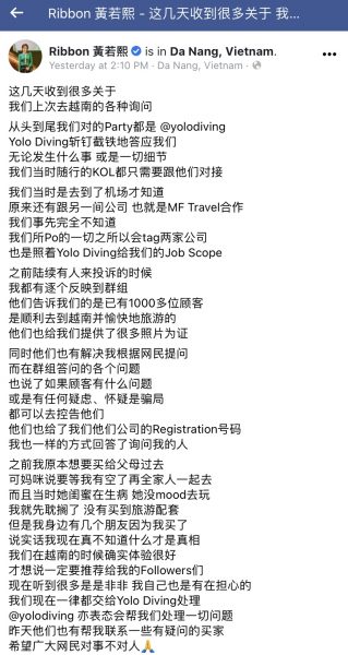 她也表示,目前受到牵连的买家,Yolo Diving旅行社愿意为他们解决一切疑问。