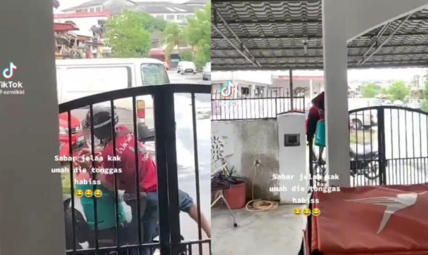 这段在TikTok疯传的视频显示,受害者的煤气桶相信是放在车房,身穿红色上衣的小偷扛起煤气桶,就动作娴熟地翻过大门,接着骑上蓝色本田Wave摩托车逃跑。