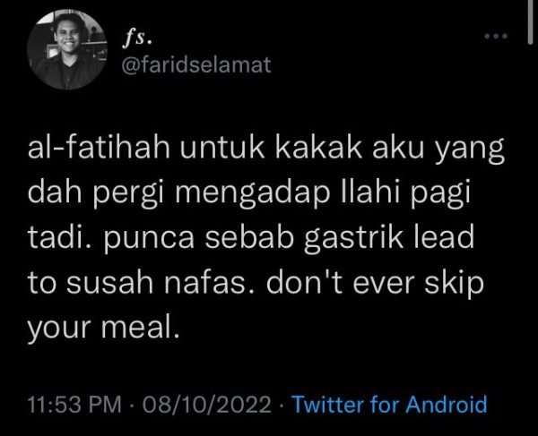 近日,一名网民@faridselamat在其社交媒体撰文分享表示,姐姐经常没吃正餐,引发胃炎而导致呼吸困难,最后丧失性命。
