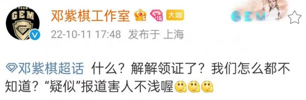 (上海11日讯)邓紫棋与造型师富二代男友Mark(魏俊杰)交往已5年,曾多次被爆结婚,近来中国狗仔大爆两人已经领证结婚,更言之凿凿指两人之后会在上海定居。不过邓紫琪工作室已经否认她与Mark领证的传言,火速辟谣说:“什么?解解领证了?我们怎么都不知道?‘疑似’报道害人不浅喔。”