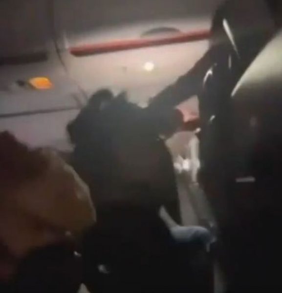 现场视频显示,两名身材高大的男子在客机里互相殴打,多名乘客试图将他们分开无果。
