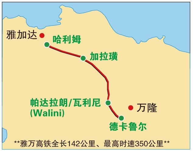 高铁一共经过4个车站,分别是哈利姆(Halim)、加拉璜(Karawang)、帕达拉朗(Padalarang)和德卡鲁尔(Tegalluar),每个车站也会连接到公共交通路线。