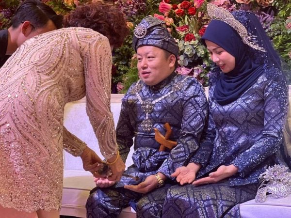 来自柔佛哥打丁宜的商人拿督邓烈康(37岁)日前与新婚妻子陈茵妮(35岁)在新山举行马来传统婚宴;婚宴上有羊皮鼓队敲击演奏,传统马来美食,新人也穿着紫蓝色的马来礼服,坐在宴会厅上的结婚礼座,接受双方亲友的祝福。