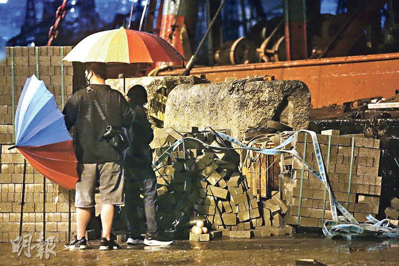 10多名死者亲友昨到葵涌殓房认尸,黄父哭成泪人,质疑砖块正常有卡板承托,砖块叠高亦不应超过“一码”,而事发时砖块绑成“两码”高,更为不稳,扬言要控告涉事公司。亲友昨晚再到现场冒雨拜祭,众人神情哀伤。