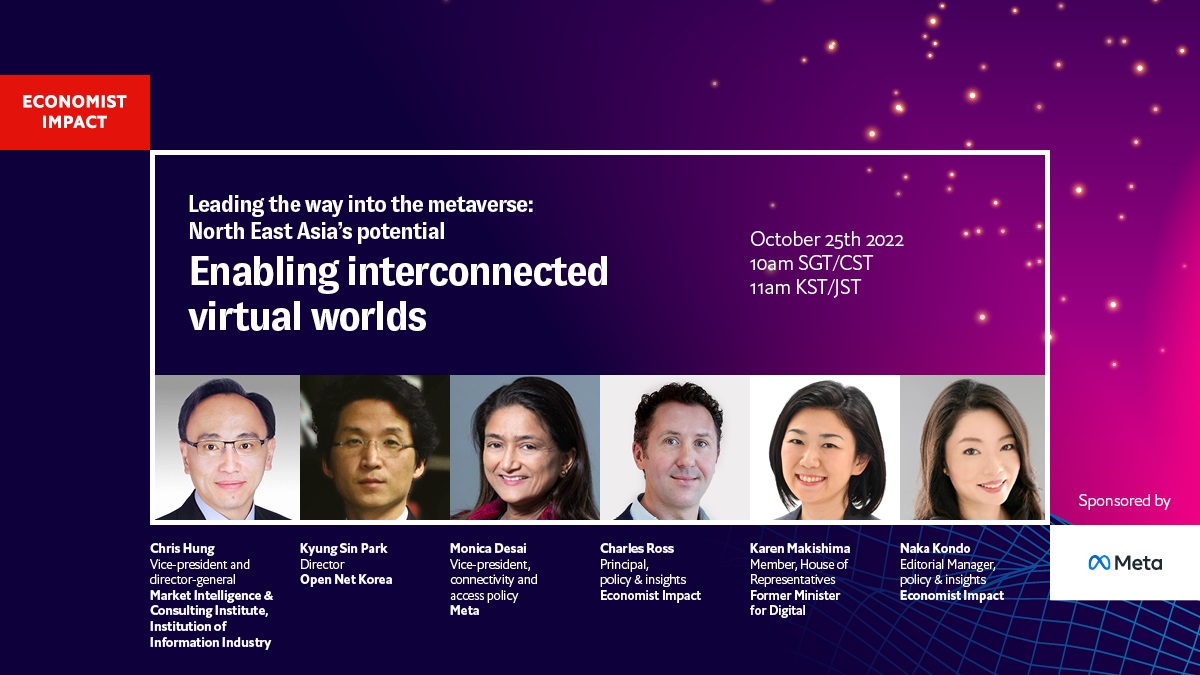Taking place online on Tuesday October 25th 2022 at 10am SGT/CST | 11am KST/JST, Economist Impact, sponsored by Meta, convenes top policymakers and industry experts to discuss hardware, connectivity and communications standards affecting the enablement of the virtual world.