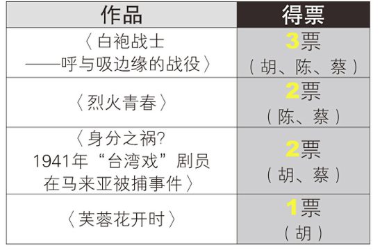 最终结果,首奖为〈身分之祸?1941年“台湾戏”剧员在马来亚被捕事件〉,评审奖为〈白袍战士——呼与吸边缘的战役〉。