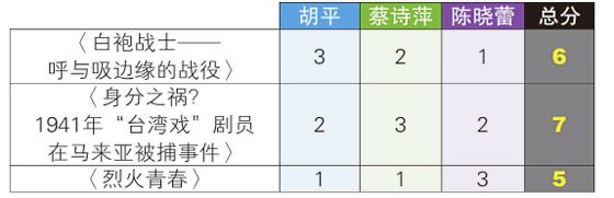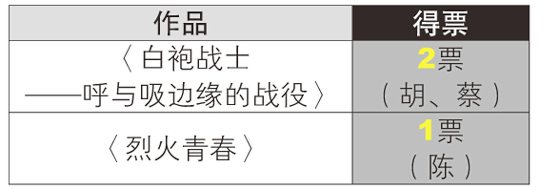 评审晋入第二轮投票,先淘汰只有一票的〈芙蓉花开时〉。蔡建议第一名打3分,以此类推。