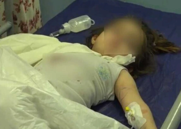女童等待手术前,可见她头晕目眩地躺在医院病床上,身上布满咬痕和鲜血,右臂上缠着绷带。