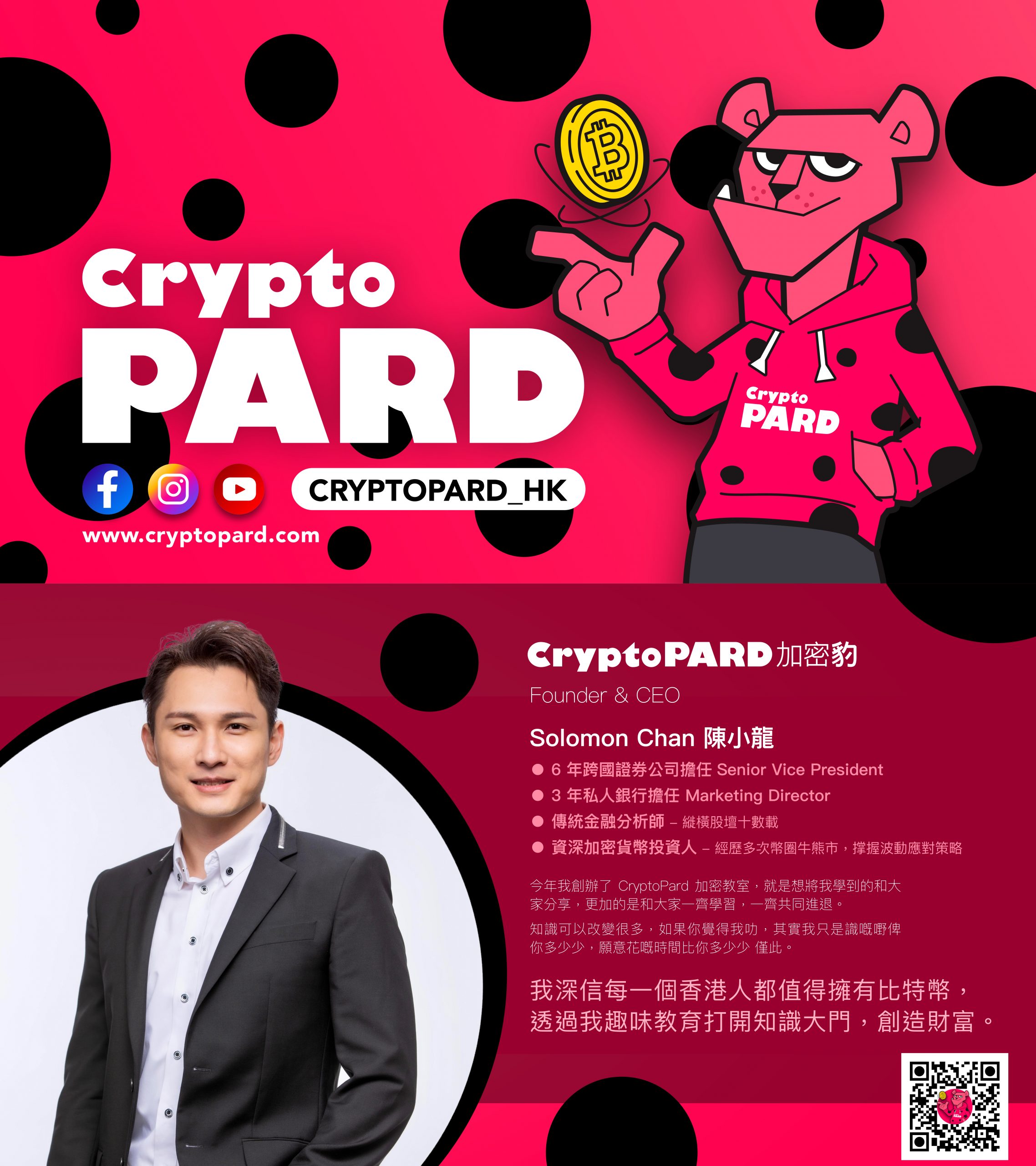The “CryptoPARD” teamed up with experienced members in financial market, the founder, Solomon Chan , has been a proficient financial analyst for years. Together with his team, Soloman spent days and nights to develope variety of courses for with accurate information, practicable tools, engaging elements at the same time keep them easy to understand.