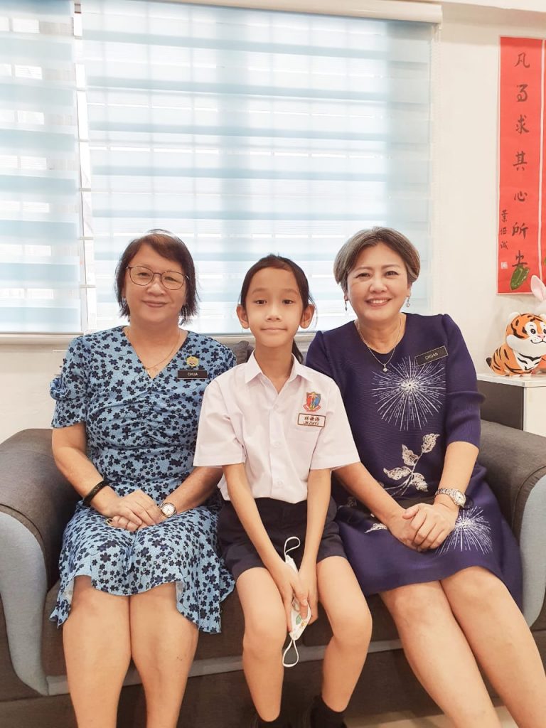 叶健一感激巴生中华小学校长蔡容金(右)和校方对孩子善举的支持。左为副校长拿汀蔡慧玲。