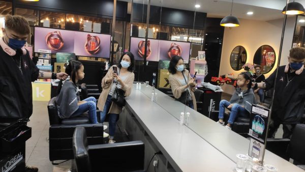 叶健一(右)拍下儿子林谦语剪发的照片。左为理发师兼林谦语表哥叶绵彬。