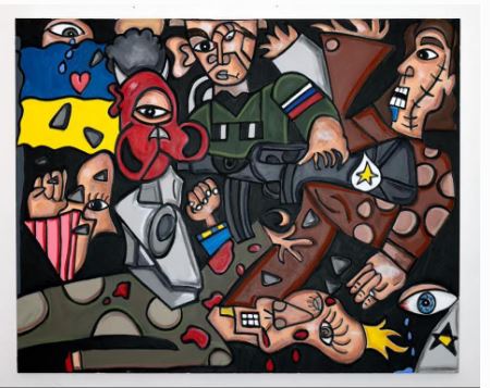 近一个世纪后,战争的可怕再次激发一个艺术家创作。住在美国圣迭戈的画家瓦伦西亚从毕卡索的作品中汲取灵感,创作了一幅名为《入侵乌克兰》的抽象画。画的左上角,一只眼睛对着乌克兰国旗哭泣;画中间,一个戴着俄罗斯国旗臂章的士兵气势汹汹地攥着一把机关枪。