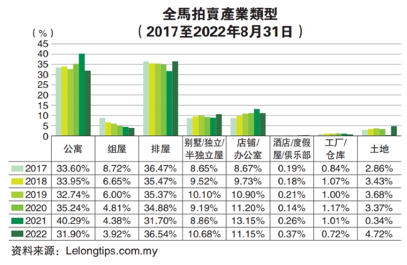 根据产业的类型,排屋、公寓或高楼住宅仍是最多被拍卖的产业,2022年分别占36.54%和31.90%,2021年最多公寓拍卖,占40.29%。