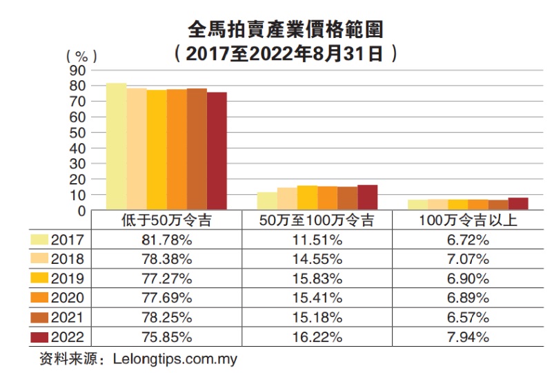 从屋价来看,在比率上有一些微妙变化。以2017和2022年做比较,低于50万令吉的拍卖房产还是占绝大多数,但是比率从81.78%减至75.85%。