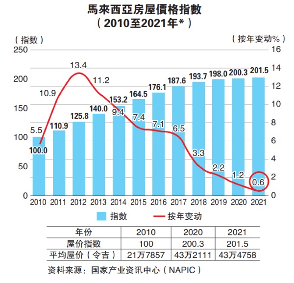从国家产业资讯中心(NAPIC)的数据看出,大马房价增幅在2011到2013年达到顶峰,涨幅分别高达10.9%、13.4%及11.2%,之后逐渐收窄,2021年预计仅0.6%增长,而2020年的平均屋价是43万2111令吉。