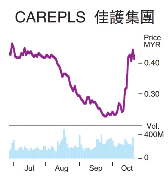 在投资者趁低抄底下,为处在低迷期的手套股注入元气,加上马股整体积极投资情绪提振,佳护集团(CAREPLS,0163,主板医疗保健组)上周在投资者热捧下,从32仙高升至41仙,全周涨9仙或28.13%。