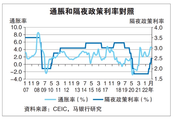 该行指出,预测调高隔夜政策利率,主要是基于通货膨胀持续上升、就业市场改善,加上2022年第三季国内生产总值(GDP)显示成长较迅速,2022首半年GDP已呈上扬走势。