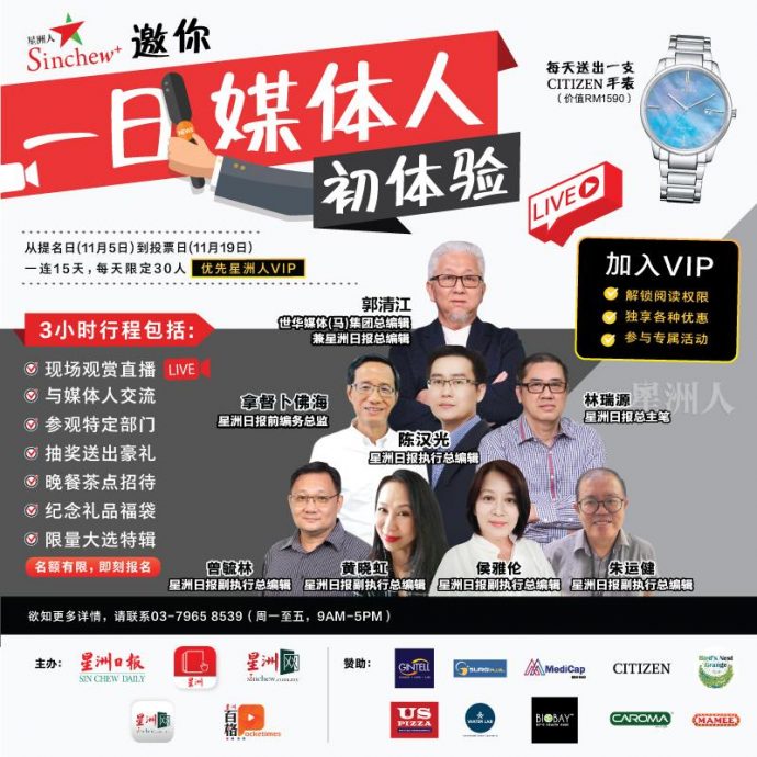 (吉隆坡27日讯)全国大选是媒体人最繁忙的时刻,也是近距离感受新闻室大作战的最佳时机。星洲人诚邀读者亲临星洲日报八打灵再也总社,体验当一日的“媒体人”,亲身了解与感受媒体人如何备战大选。每一场活动的出席者,还有机会赢得价值RM1590的CITIZEN手表。