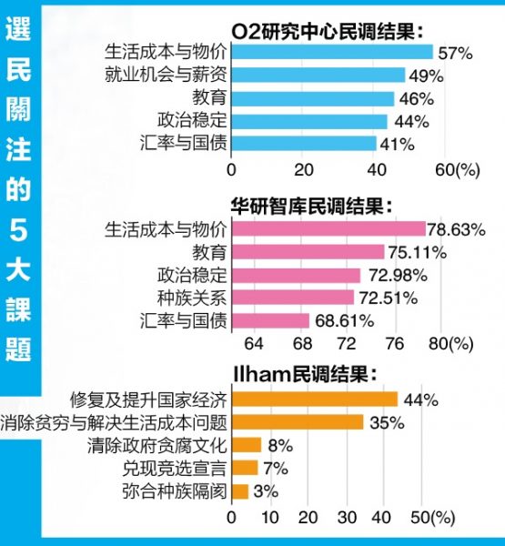 华研智库的调查结果显示,高达78.6%的受访者认为生活费和物价高涨是人民当前所面临的主要课题;O2研究中心和Ilham的调查提到,分别有57%和35%的民众寄望新政府消除贫穷、解决生活费及物价高涨的问题。