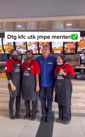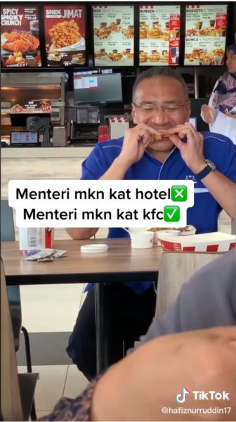 希山慕丁亲民地到快餐店用餐视频疯传,获大赞部长并非上酒店,而是到KFC用餐。(截图自视频/hafiznurruddin17)