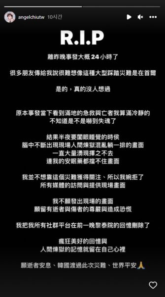 事发一天之后,安琪也收到许多人的关心,因此再度于限时动态PO文,表示“离昨晚事发大概24小时了,很多朋友传给我说很难想像这种大型踩踏灾难是在首尔。是的,真的没人想过。原本事发当下看到满地的急救与亡者我算满冷静的,不知道是不是吓到失魂了,结果半夜要阖眼睡觉的时候,脑中不断出现现场人间炼狱混乱躺一排的画面,一直大量涌现挥之不去,连我的安眠药都挡不住的画面。我并不想靠这个灾难获得关注,所以我婉拒了所有媒体的访问与提供现场画面”。