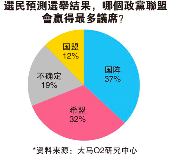 O2民调针对预期选举结果的调查,有37%认为是国阵,32%是希盟,12%是国盟,有19%不确定谁会赢。