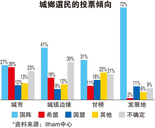 除了华裔、穆斯林土著和非穆斯林土著,国阵在其他族群,包括城乡地区的选民都占优势,特别是居住在垦殖区的选民,有高达72%会支持国阵。
