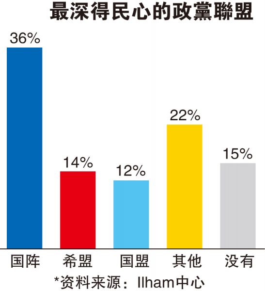 根据Ilham民调显示,有35%选民会支持国阵,远高于希盟(18%)、国盟(12%)、其他(15%)和不确定(21%)。
