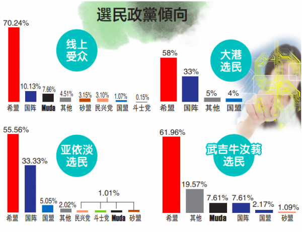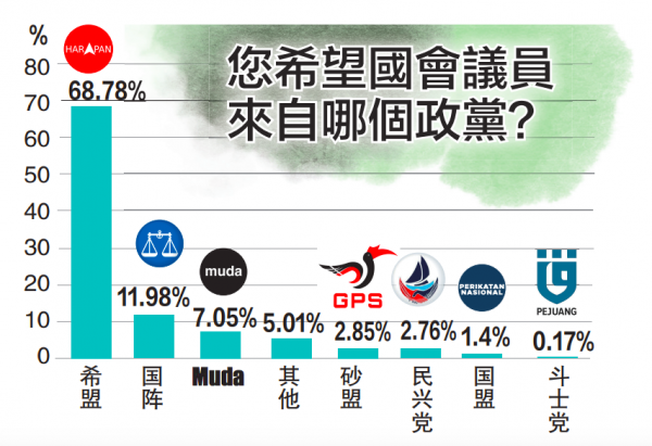 整体而言,参与民调的华裔选民被询及希望国会议员来自哪个政党/联盟时,选择希盟的比例明显更高,达68.78%;支持国阵的选民有11.98%;接着是大马民主联合阵线(MUDA),也有7.05%的支持率。