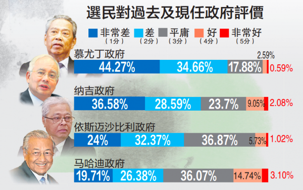 这份民调也让华裔选民为历届政府的表现“打分数”,大部分参与民调的人都对前首相丹斯里慕尤丁领导的国盟政府感到不满意,只打1分的选民多达44.27%,打2分的也有34.66%。