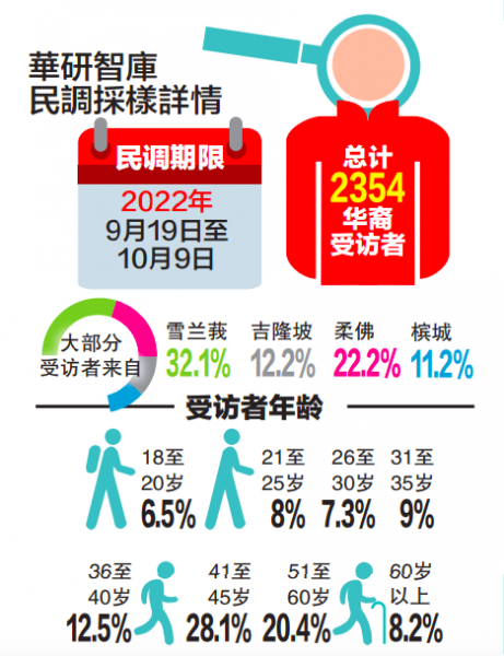华研智库于今年9月19日至10月10日针对华裔选民的投票意愿和倾向,进行了为期21天的民调,总共针对2354份问卷进行分析,其中293份来自3个选区(槟城武吉牛汝莪、雪兰莪大港及柔佛亚依淡)的华裔选民,2061份来自线上问卷调查。