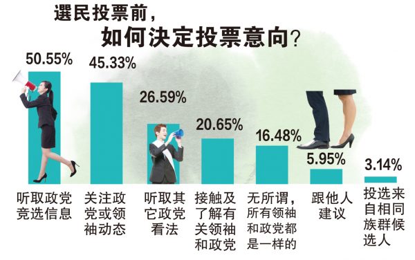 民调也询问选民在选前会以哪些资讯作为参考,其中有50.6%的华裔选民会出席和聆听政党的竞选造势活动,45.3%会选择关注政党和领袖的动态。