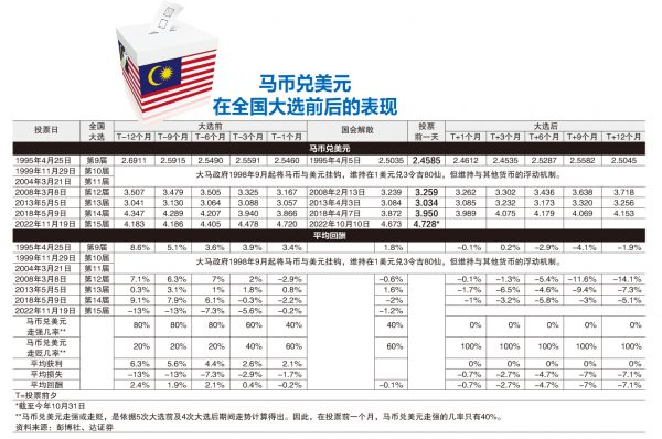 分析员在对比过去5届大选后的马币走势,发现马币兑美元在大选结束后会有几个阶段的走贬,即第1个月会走低0.7%、第3个月跌2.7%、第6个月探低4.7%、第9个月贬值7%,及第12个月跌7.1%。