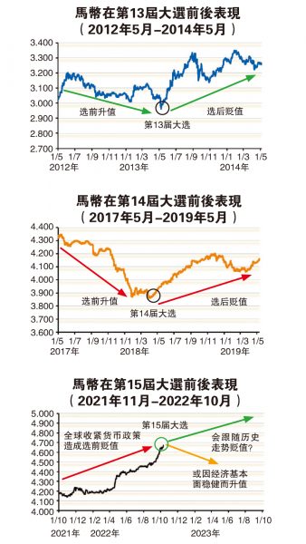 “纵观1990、1995、1998、2013及2018年的全国大选,马币都走贬。我们认为,这或许是外国投资者撤回资金所致,因此这届全国大选结束后,马币兑美元若持续贬值,我们并不会感到意外。”