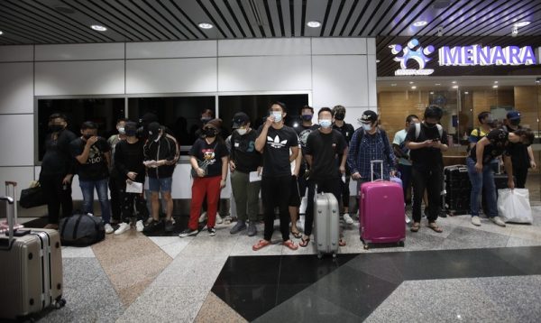 据记者在场观察了解,这批猪仔大部分为华裔男子,年龄介于20至40岁,从机场出来时,纷纷低头躲避媒体的镜头。