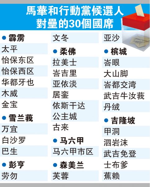 行动党和马华这对传统政敌将在30个国会选区交锋,但它们在这些选区都有其他对手,其中有15个选区三角战,7个选区四角战,5个选区五角战,其余3个选区,都分别出现六角战、七角战和八角战。