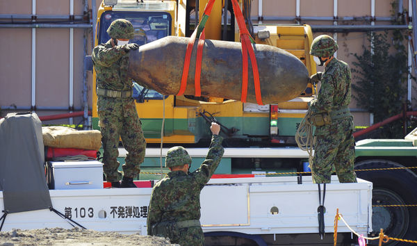 这枚未爆弹长约1.8公尺、直径0.6公尺,陆上自卫队未爆弹药处理队于上午10时开始拆除引信,约30分钟后完成工作,弹体则由自卫队带走处理。相关人员在确认安全无虞之后,解除相关管制措施。(美联社照片)