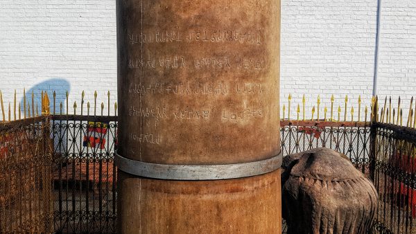 这一根举足轻重的石柱,如今树立在摩耶夫人寺庙的西侧,柱上有古老的波罗米文(Brahmi),铭刻着当年阿育王颁布的敕文:“天佑慈祥王登基廿年,亲自来此朝拜,因为这里是释迦牟尼诞生之地,一块石上刻着一个形象,并建立一根石柱,表示佛陀在这里降生;蓝毗尼村免税,只须付收成的八分之一。”这一根打磨光滑的棕色石柱,如同嵌镶在时间上的刻度,不仅让印度的一段古代历史有了准确的年代,也证实了佛陀是一个有血有肉的历史人物。