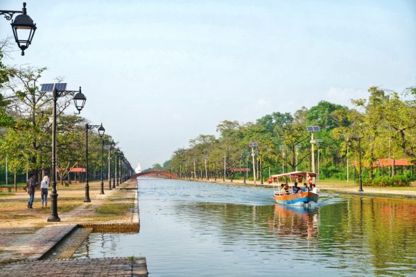 我现在看到的,是占地超过500公顷的蓝毗尼园区,由日本建筑师丹下健三设计和规划。呈长方形的园区被划分为3个部分,由一条全长1公里半,两旁均有步行道的中央运河串连,以摩耶夫人寺庙为主的圣园遗址坐落在最南端,中部的运河两旁属于国际寺院区,运河以东分布着小乘佛教的寺院,运河以西则遍布着大乘佛教的寺院,世界和平佛塔位于园区的最北端,与摩耶夫人寺庙遥遥相望。