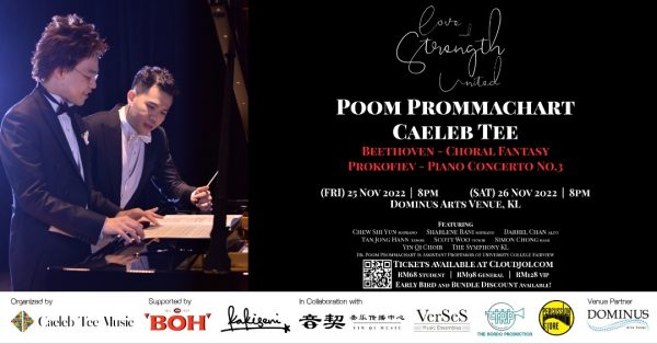 施坦威钢琴家Poom Prommachart,以及马来西亚指挥家郑联晨 (Caeleb Tee),将演出两部精湛的古典乐作品。这一场由两位音乐家亲手策划举办的 音乐会,主题为 “Love and Strength United”,将为观众呈现贝多芬的作品《合唱幻想曲》 ——一首由钢琴独奏、独唱、歌咏队、交响乐团联合演出的作品,以及普罗科菲耶夫 (Prokofiev)的作品《第三钢琴协奏曲》,这是钢琴协奏曲目中最难的一首作品。
