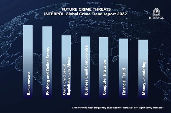 根据国际刑警组织的《全球犯罪趋势》报告,未来的网络犯罪威胁会越来也多,而排在前三名的网络犯罪行为是勒索软件、网络钓鱼攻击和网络儿童性剥削和性虐待。