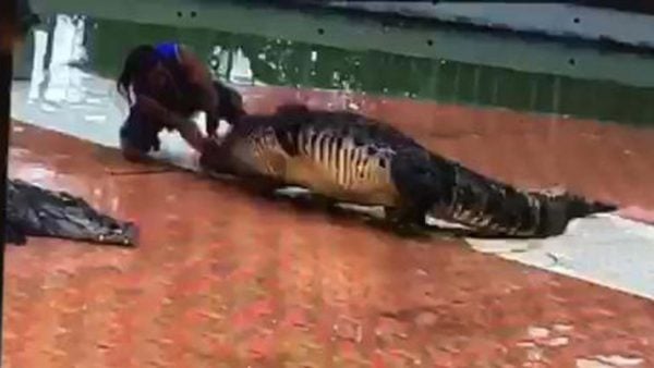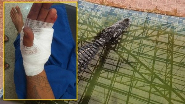 训练师挑逗鳄鱼 右手被咬皮开肉绽