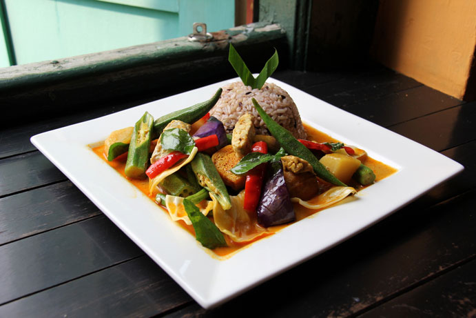 “地理学家”的食物,以素食居多,这碗咖哩面却让我吃出另一番“历史”情怀,尤其知道了当中是以腰果泥及其他坚果来替代胆固醇含量高的椰浆后,一份贴心感更油然而生,不禁品味再三;就像其他食物如糙米椰浆饭,素食咖哩饭和创意Tempe等,从健康养生与美味的角度,都可以看出食谱提供者Wendy小姐对食物的细心看待。