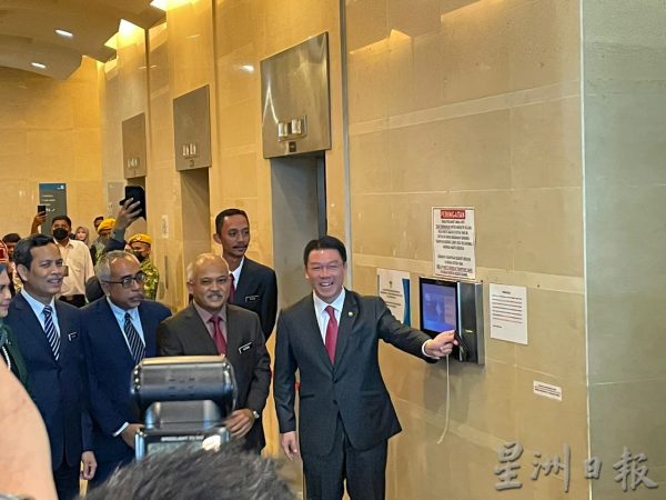 地方政府发展部长倪可敏今早8时50分在部门打卡上班后,在部门大厅向官员发表简短谈话。