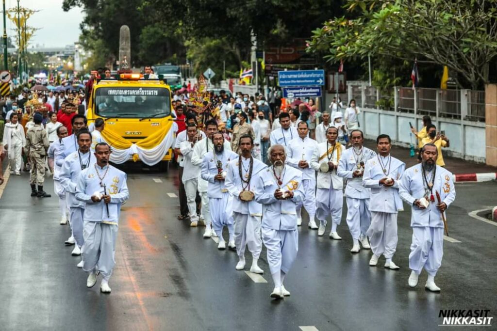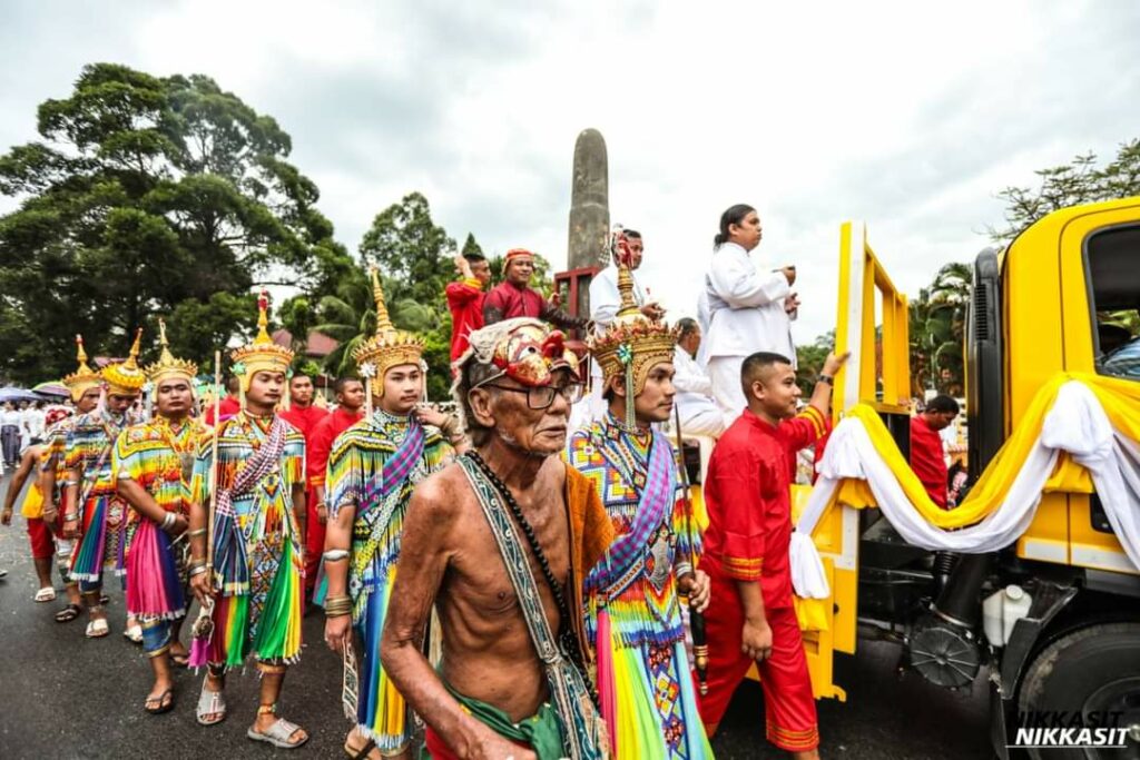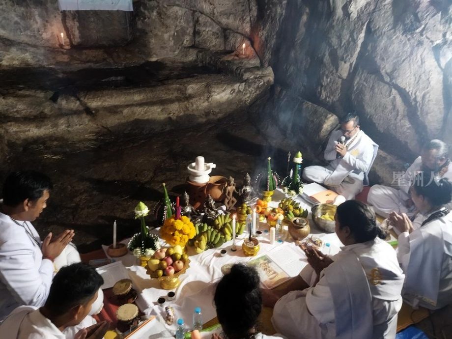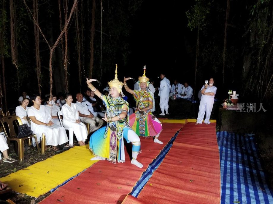 宗教师们都蓄发,穿白色衣裤,裤子是一块长布围绕在腰际,剩下的长布则卷起长条状,再从前面往后面绕去系在后部。他们围坐在洞内诵经,一段经文结束就吹起法螺敲起铜锣、摇起拨浪鼓及手玲,如此重复多次直到仪式完毕。人们把新的印度教神像带过来参与诵经,其中一尊维湿奴(Vishnu)铜像极为古旧,其余新的为乌摩天妃(Uma Devi)和欢喜天象头王财神(Ganapathi),也有许多供品等。现场延聘泰国民间宗教舞蹈表演,鼓乐及古装舞蹈员落力表演,氛围热闹隆重。每个舞蹈员在表演前,先会礼拜一位老师父,老师父头戴面具,口念经咒加持。有两个小孩表演“傩舞”(戴面具),此外还有个歌舞表演,几个舞蹈员一唱一答,诙谐对答引人发笑,一些人赏钱给他们。