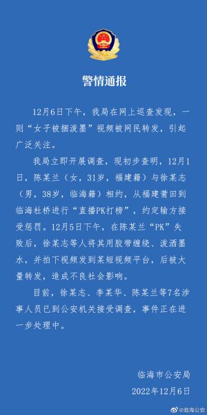 福建临海市公安局发布警情通报,初步调查发现31岁陈姓女子和38岁徐姓男子相约,从福建莆田到临海杜桥进行“直播PK打榜”,约定输方接受惩罚。